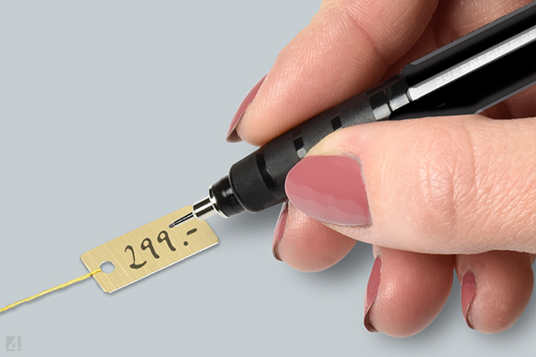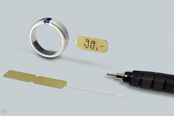 Was früher schlichte Notwendigkeit war, ist heute ein Zeichen von Exklusivität: mit schöner Handschrift geschriebene Etiketten. Sie sprechen für Sorgfalt, die sich bei der Preisauszeichnung oft nur leisten kann, wer auf ein überschaubares Sortiment erlesener Stücke spezialisiert ist. Denn Handauszeichnung ist zeitintensiv und nicht rationell. Doch Gold- und Silberschmiede wie auch der individuell geführte Einzelhandel gehen vielfach ganz bewusst diesen Weg der Etikettierung. Sie vermittelt eine persönliche, künstlerische Note und zwingt bei kleinen Stückzahlen weder zu aufwändiger Organisation noch zu großen Investitionen.