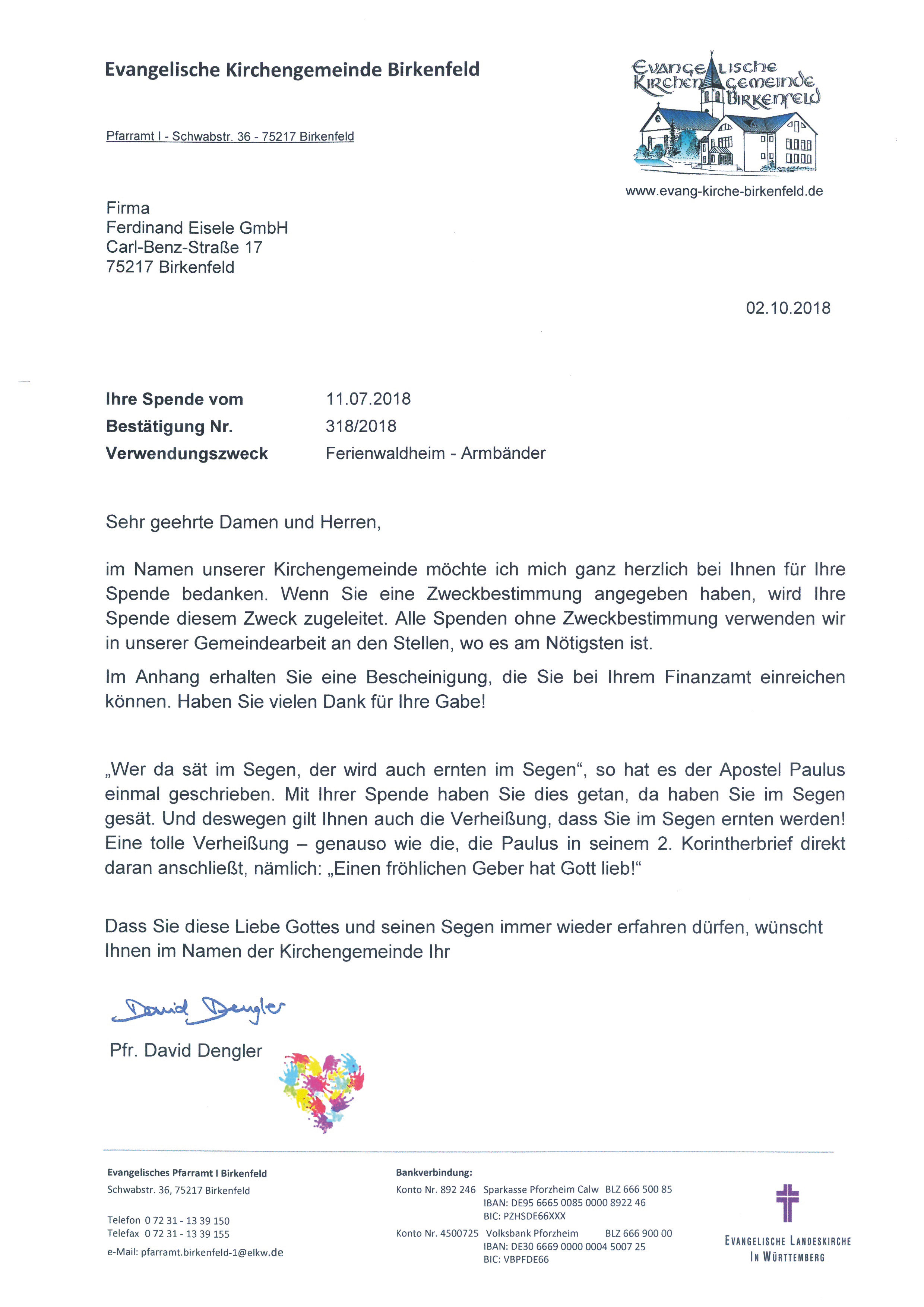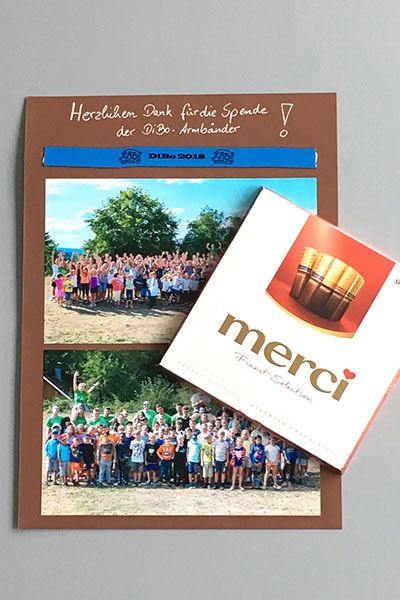 Seit Jahrzehnten veranstaltet traditionell die evangelische Kirchengemeinde ein Ferienwaldheim im Dietrich-Bonhoeffer-Gemeindesaal „DiBo“ am Ortsrand. Dort werden in zwei Gruppen für zweimal zwei Wochen rund 200 Kinder aus der Kommune betreut. Damit bei Spaß, Spiel, und Ausflügen nicht doch ein Kind übersehen wird, erhielten alle Teilnehmer als „Ausweis“ ein Armbändchen mit dem DiBo-Logo. Die Kosten für die Herstellung dieser Bändchen hat 2018 die Ferdinand Eisele GmbH getragen.