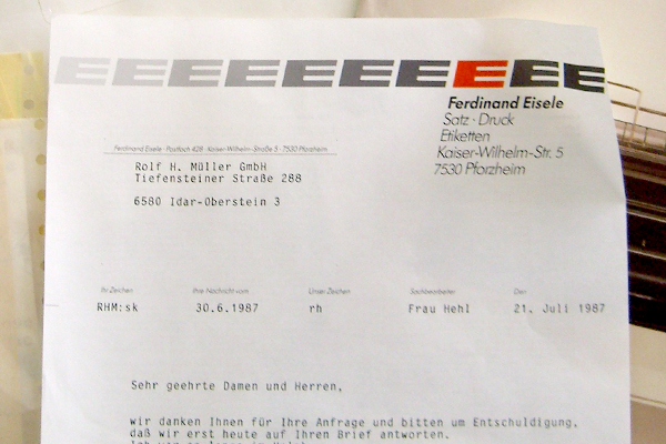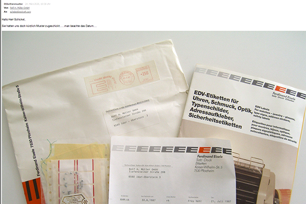 25.März 2020. Kürzlich erreichte uns per Mail das Foto einer Mustersendung von 1987. Der Kunde steht momentan mit uns in engem Kontakt wegen der Anpassung unserer Software eXtra4<gemId> für Edelstein-Management an seine Belange und war auf das "Antike Stück" gestossen. Er hatte es die lange Zeit über komplett aufbewahrt, mit Umschlag, Anschreiben, Mustermaterial und Prospekt.Augenzwinkernd schreibt er dazu: "Sie hatten uns doch kürzlich Muster zugeschickt ... man beachte das Datum...".