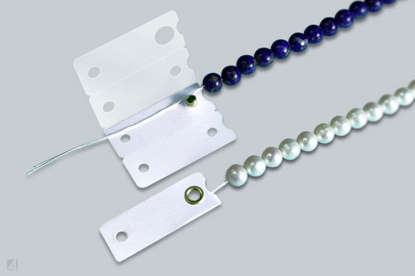 Perlenstränge stellen an Schmucketiketten besondere Anforderungen. Hier wünschen Anwender gleichzeitig mit der individuellen Auszeichnung auch das manipulationssichere Verschließen des offenen Strangendes. Das Etikett soll zuverlässig verhindern, dass Perlen unbemerkt verloren gehen, ausgetauscht oder entwendet werden. Zu diesem Zweck verbindet man Perlen-Etikett und Perlen-Strang mit einer Metall-Öse, sodass das befestigte Etikett den Strang versiegelt und vor unbefugtem Zugriff schützt.