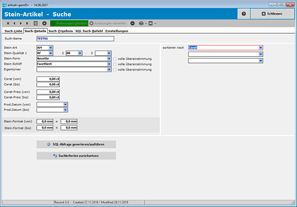 Für das gezielte Selektieren bestimmter Steine aus dem Steinbestand fokussieren zahlreiche Parameter die Suche auf Steine einer definierten Qualität. Dies geschieht im Rahmen einer SQL-Abfrage. Sie kann für immer wiederkehrende Such-Routinen auch mit allen Parametern gespeichert werden.
