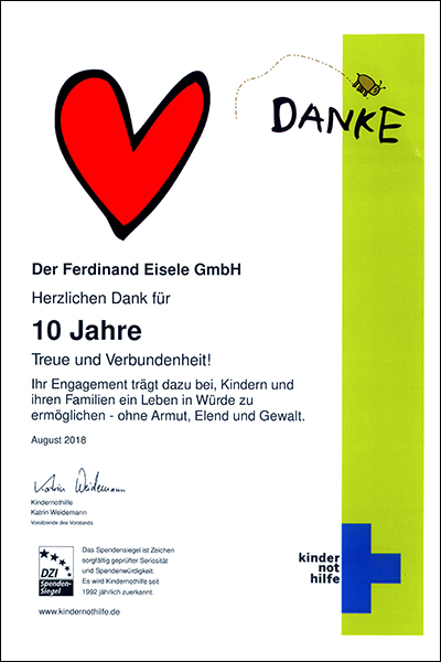 Seit 2008 unterstützt die Ferdinand Eisele GmbH über NGOs und deren Partner vor Ort mit jährlich einem fixen Prozentsatz vom Umsatz humanitäre Projekte und übernimmt Patenschaften für bedürftige Kinder.